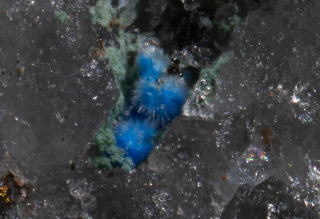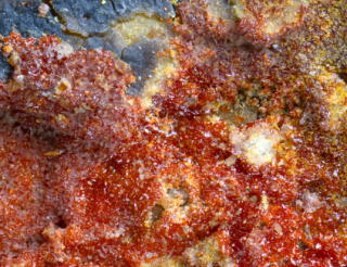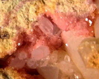 上の画像は、初めてアガード石を手にした奈良県の三盛鉱山のもの。そのアガード石をルーペで見たときが、およそ上画像程度のサイズになる。もうひとつ小さな凹みに覗いていたやつを超拡大したものがマウスポイントの画像。ミクロ探検気分だ。なお、最後に訪れた4年程前には二次鉱物自体が激減していた。