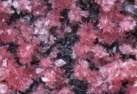 ずいぶん前になるが、大勝鉱山の画像(下の画像)を使った恩師への年賀状で「これは石から生まれた花のようです」。と言葉を添えたのが、「本当に石に咲く花があるんですね」と感心されてしまったことがあるのを思い出した。例えのつもりでのお話だったのが、信用されてしまった、という話。それは下画像針球状結晶の断面(花びら状)が出てしまったものだった。その、下の画像をポイントするとコバルト華を持つ母岩のさまであり、これは通常見ることの多い赤〜ピンク色の球状の結晶集合体になる。大勝鉱山ではけっこうこのタイプが多いが、他の産地ではピンク色のぶどう状もある。そして多いのはペンキのような皮膜状のものだ。