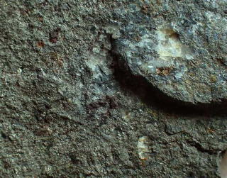足尾、大谷、生野など過去産出の地からの数少ない画像を拾い出して総合してみると黒灰〜灰〜黒緑色と幅広く、そこに黄銅鉱に似た(黄銅鉱チップの色合いよりも何となく地味、黄銅鉱より少しなめらか)小さな断片がパラパラと埋め込まれているという程度にしか表現しにくい。画像をマウスポイントで別画像を加えておいた。